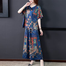 恒潮奢华高档唐装女中国风套装两件套旗袍2021中年妈妈气质中式女装民族风 蓝色 L