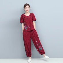 恒潮奢华高档复古唐装套装两件套改良版旗袍汉服女中国风2021春款中式女装 酒红色 M