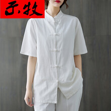 示牧品牌女装2021夏季中国风复古棉麻茶艺服短袖立领唐装佛系禅修居士服上衣女 白色 上衣 L