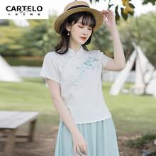 卡帝乐鳄鱼汉服女中国风大码绣花茶服复古唐装上衣民国风改良短袖旗袍两件套 8380白色上衣 M