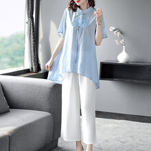 ℠〶 高端小个子改良旗袍汉服成人唐装女中国风套装民国风复古女装汉服女棉麻中年妈妈夏装改良旗袍 浅蓝色 XL