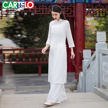 卡帝乐鳄鱼轻奢女装 中国风民族文艺复古唐装连衣裙奥黛旗袍阔腿裤套装两件套禅意茶服 白色套装 S