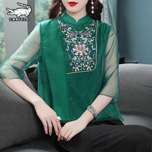 卡帝乐鳄鱼唐装女上衣复古风刺绣女2021春夏新款民国汉服日常超仙中式旗袍潮 绿色 L