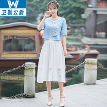 卫勒公爵汉服女唐装民国复古改良短袖旗袍上衣两件套装中国风棉麻盘扣茶服 蓝色 L