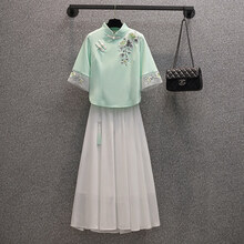 ℠〶原创改良汉服女成人穿夏古装汉服女中国风夏季成人通勤民国风唐装旗袍上衣古风裙子套装仙 绿衣+白裙 XL