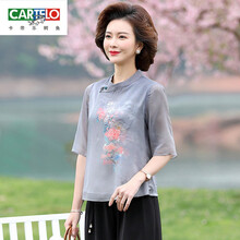 卡帝乐鳄鱼【高端女装】中国风妈妈夏装汉服旗袍上衣中年女装唐装2021新款中老年短袖套装 灰色上衣 2XL(105-120斤)