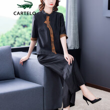 卡帝乐鳄鱼女装品质唐装女夏套装改良旗袍短袖薄款中国风高端盘扣香云纱中式上衣仿真丝 黑色 L