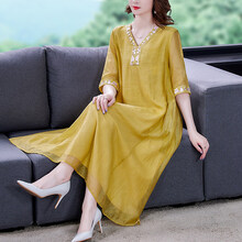 高档轻奢品牌唐装中国风女装旗袍改良版连衣裙高端棉麻中年妈妈裙子宽松中长裙气质女装 黄色 M