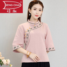 恒潮奢华高档中国风夏装禅意女装中式唐装旗袍茶服改良绣花棉麻盘扣上衣套装女 粉色上衣 S