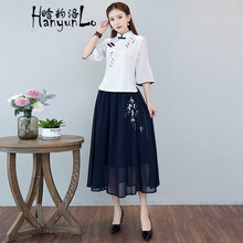 晗韵洛民国风改良旗袍上衣套装女夏季中国风仙气薄款汉服唐装学生日常两件套 白色上衣+蓝色裙子套装 XXXL