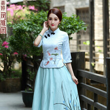 唐装套装女复古夏新款修身短款七分袖民国棉绣花短袖套装长裙 杏色中袖长裙套装 XXXL