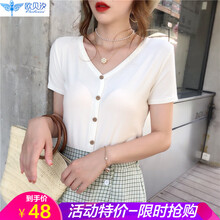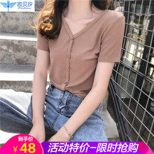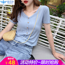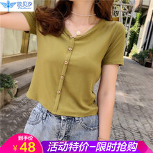 短款t恤女v领短袖宽松白色夏季纯色韩版学生体恤高腰上衣 芥末绿 均码 【建议80-120斤】