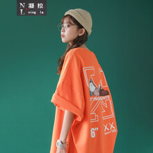 @凝拉@ 港风ins潮牌设计感小众t恤女2021年新款宽松圆领短袖男女中性上衣bf风情侣装 橘色 XL