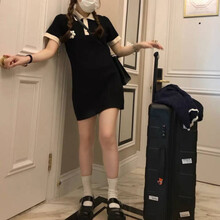 2021夏季新款短袖连衣裙子学生连衣裙女小香风Polo领夏季温柔气质撞色复古学院风小黑裙百搭学生 黑色 S