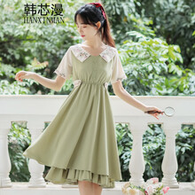 2021夏季新品文艺复古女生裙子夏天连衣裙女学生韩版宽松长款小清新ins仙气质甜美淑女学院风中长裙 蓝色 XL