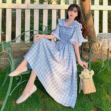 津昔亚 法式海军领蓝白格子连衣裙夏装新款大码胖MM日系可爱减龄甜美长裙 蓝白格 2XL(140-160斤)