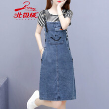 北极绒背带裙女夏季2021年新款气质显瘦吊带裙假两件薄款短袖牛仔连衣裙 条纹假两件 M 建议90-105斤