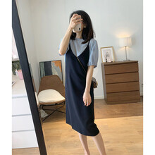 眉梢芙语 显瘦上衣裙子两泡泡袖T恤细肩带中长款V领吊带连衣裙女夏套装 蓝色上衣+黑色裙子 S