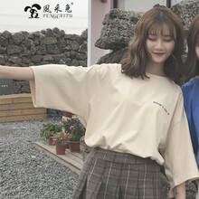 风采兔 短袖t恤女学生宽松韩版ulzzang百搭同款半袖ins超火的潮人上衣服 杏色 M