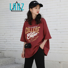 岚烨ins短袖t恤女中长款夏季上衣网红款磨边字母半袖学生宽松复古圆领打底衫潮 红色 均码