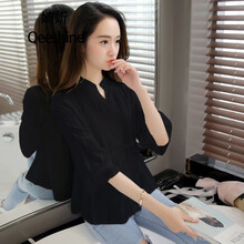 白色女衬衫短袖韩版七分袖V领全棉衬衫女装2020夏季新款设计感小众上衣气质衬衣女潮 黑色 M (95斤-110斤)
