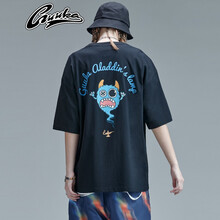 GUUKA潮牌小怪兽恶搞神灯印花短袖T恤女2021夏季新品日系嘻哈街头运动可爱潮流宽松中性风半袖上衣 黑色 M