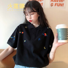 火莲娜 日系polo衫ins短袖t恤女宽松2020夏季新款刺绣小清新韩版百搭原宿bf风mschf上衣 黑色 XL