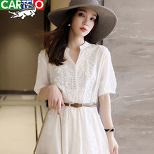 卡帝乐鳄鱼 品牌高端女装 春夏重工裙纯棉白色刺绣镂空连衣裙V领日系夏季海边度假沙滩裙 白色 2XL