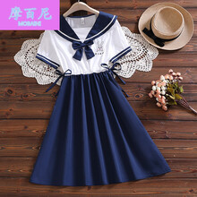 摩百尼00后少女装适合14-20岁初中生日系水手服夏季女大童12-1学院风学生海军领刺绣连衣裙145 藏青色 L