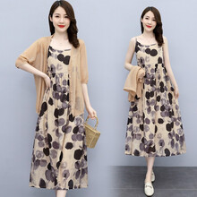 香爱蜜 棉麻短袖连衣裙女2021年夏季新款韩版轻薄时尚休闲亚麻五分袖上衣女吊带印花裙子两件套套装潮 图色 L