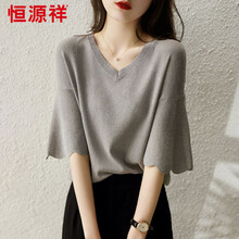 恒源祥短袖T恤女2021夏季新款日系淑女风v领喇叭袖薄款短袖t恤女宽松显瘦纯色百搭女小衫1978 灰色 M