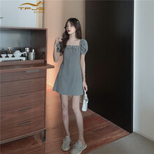 TPJG【 官方】 2021夏季新款可盐可甜2021夏季新款方领泡泡袖工装连衣裙女显瘦气质小黑 深灰色 M90-100