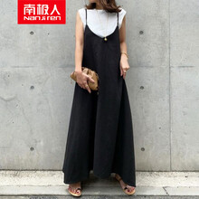 南极人高档轻奢日系宽松V领黑色吊带长裙2021春夏新款无袖大摆气质A字过膝连衣裙 黑色 均码