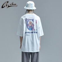 GUUKA古由卡×狮来运转联名潮牌卡通文字印花白色短袖T恤女国潮2021夏季宽松嘻哈情侣五分袖tee 白色 XL