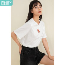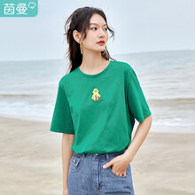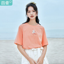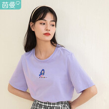 茵曼 INMAN 新疆棉2021夏装时尚花朵蜗牛包针绣花棉麻姑娘印花圆领短袖T恤女休闲1812|091 绛紫色 M