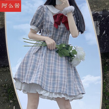 阿么茜夏天日系连衣裙子少女夏装2021新款初中高中学生小清新娃娃领格子短裙子女 蓝色格子裙配蝴蝶结 M