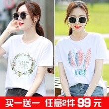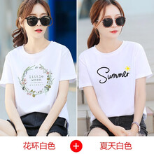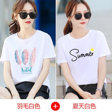 笙韵【两件装】短袖t恤女宽松2021春夏季韩版大码女装圆领半恤学生上衣打底衫休闲闺蜜装团体班服定制 白色花环+白色羽毛 L(建议100-110斤内穿)