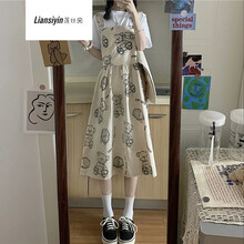 莲丝茵初中学生女生高中生大学生女装背带连衣裙少女生夏装2021新款学生日系可爱学院风长裙子 杏色背带裙 M
