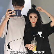 低调的依恋法式情侣装夏季2021新款潮流春秋季小众设计感网红ins火短袖T恤套装团体班服定制 放风筝白色男+黑色女 男XL+女M