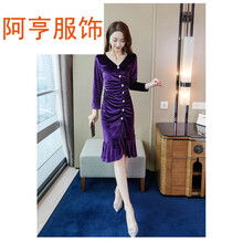阿亨OL优雅通勤女神御姐白领25-30岁春装金丝绒连衣裙女装新款潮秋冬裙子礼服裙女宴会气质鱼 紫色 S